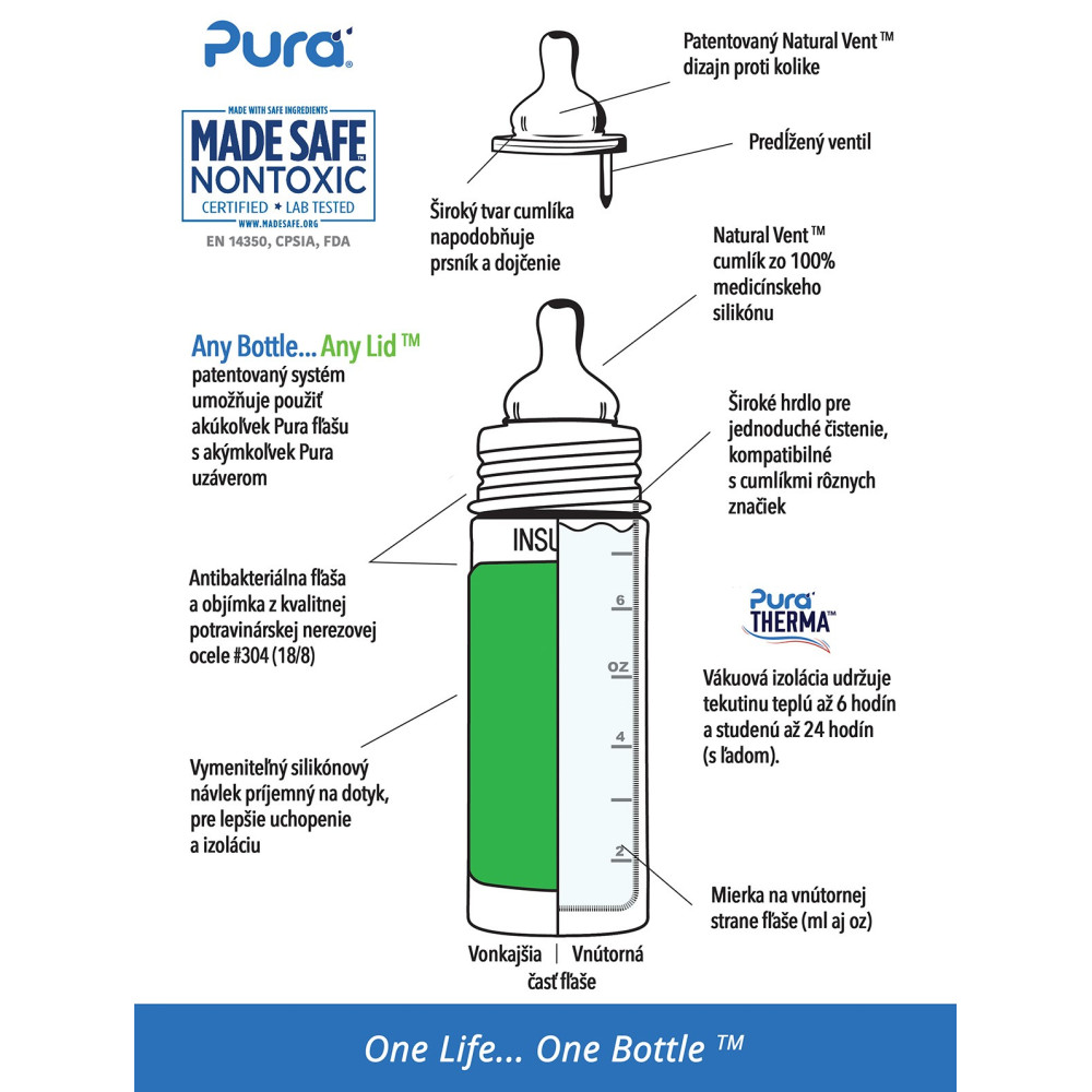 Pura dojčenska TERMO fľaša 260 ml - aqua je bezpečná fľaša vyrobená 100% bez plastových častí. Konečne bezpečná fľaša vyrobená 100% bez plastových častí. S Pura fľašami si môžete byť istí, že sa do nápoja vnútri neuvoľňujú žiadne škodlivé látky a toxíny, ani príchute a pachy ako je tomu u plastových fliaš alebo fliaš s plastovými vrchnákmi. Na ničom nezáleží viac ako na zdraví Vašich detí a Vás.