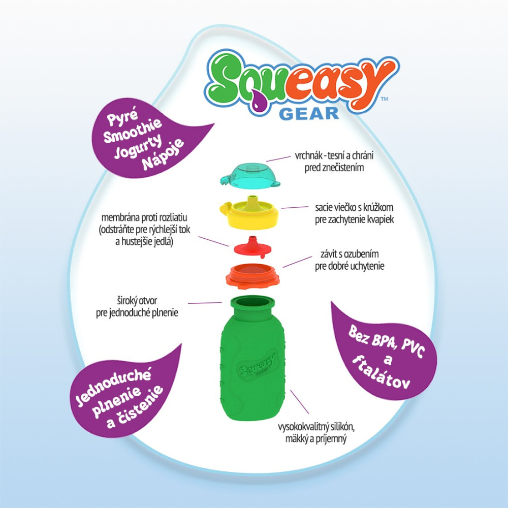Squeasy Snacker kapsička je výnimočne praktickým pomocníkom pre zdravé kŕmenie detí. Doma, vonku, na cestách, v škole či škôlke… kdekoľvek si môžu deti pochutnávať na domácom ovocnom pyré, smoothie, zeleninovej kaši, jogurte či obľúbených nápojoch. Vďaka membráne proti rozliatiu je obsah v bezpečí aj u tých najneposednejších šibalov.
